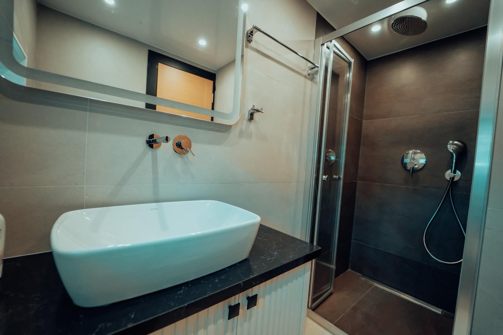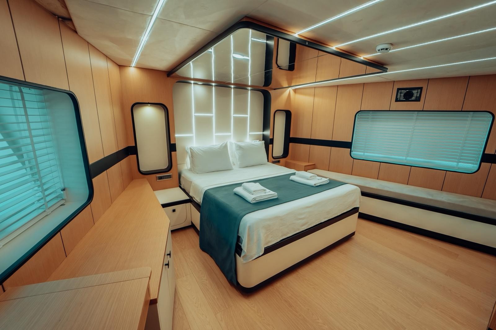 Her kabin klima, sıcak/soğuk su, en-suite banyo ve yüksek kalite tekstil ürünleri ile donatılmıştır. İç alanlarda modern dekorasyon ve konfor ön plandadır.