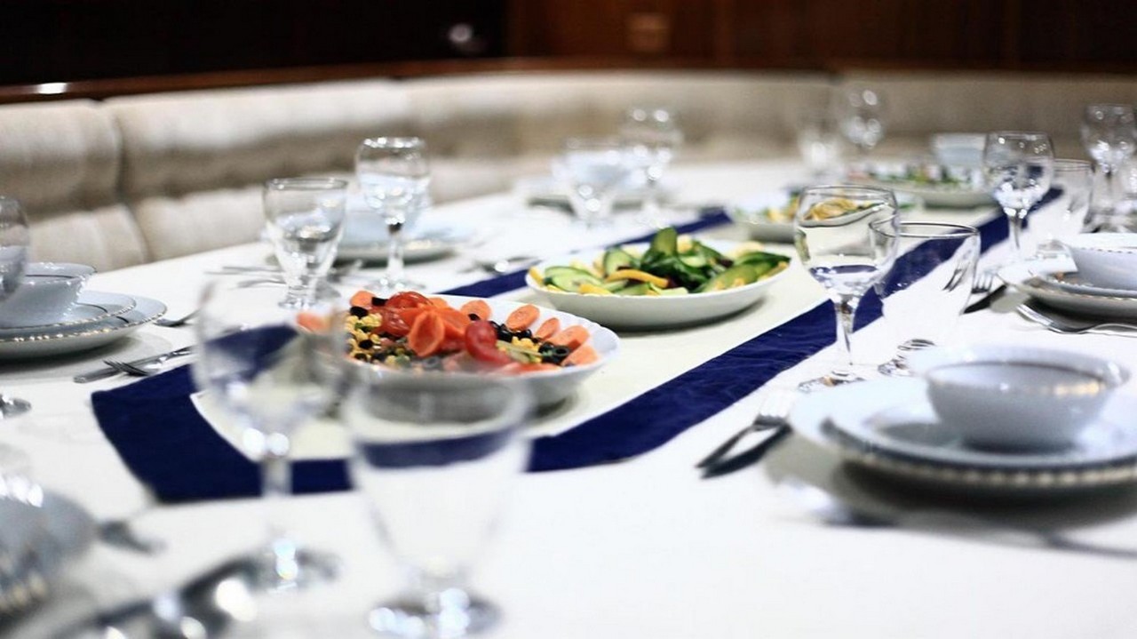 Teknenin iç mekânı geniş ve kullanışlıdır. Salon bölümünde: