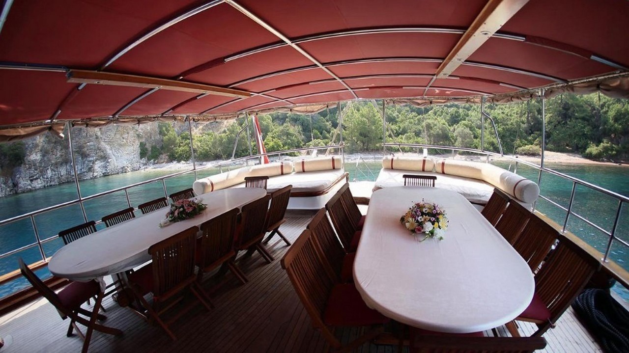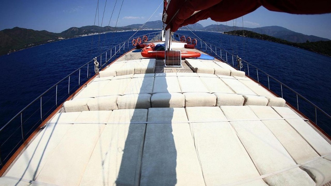 Caferoğlu 7 Gulet’in geniş güverte alanları, deniz manzarası eşliğinde keyifli vakit geçirmenizi sağlar: