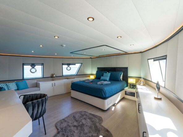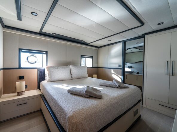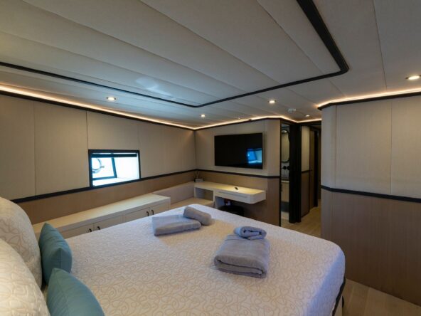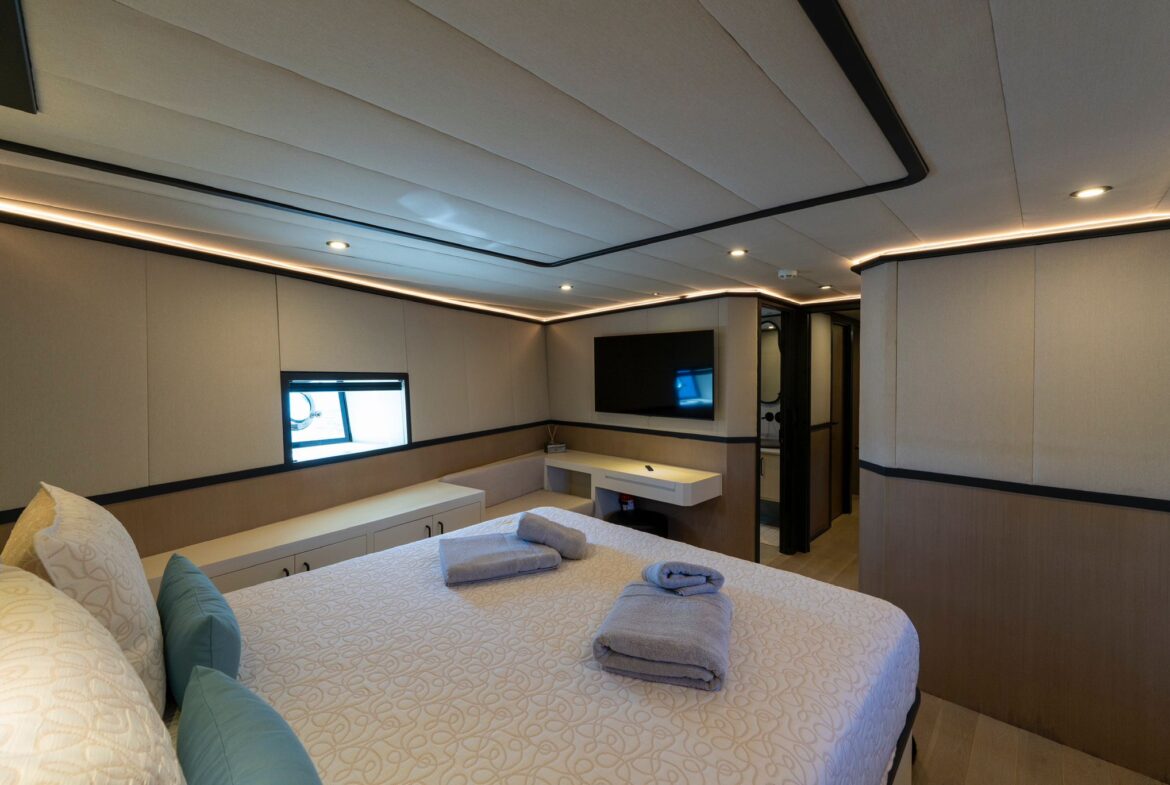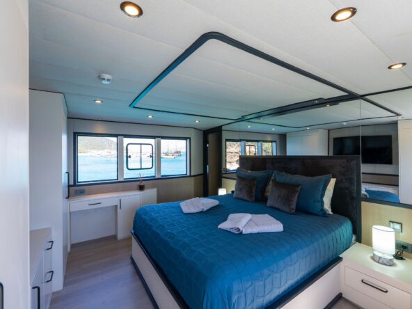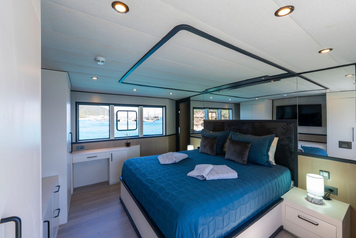 - 1 Master Kabin: Geniş ve ferah yapısıyla ön plana çıkar. Lüks mobilyalar, yüksek kaliteli yatak, geniş gardırop alanları, özel duşakabinli banyo, klima ve TV bulunur. Doğal ışık alan pencereleriyle rahat bir yaşam alanı sunar.