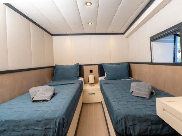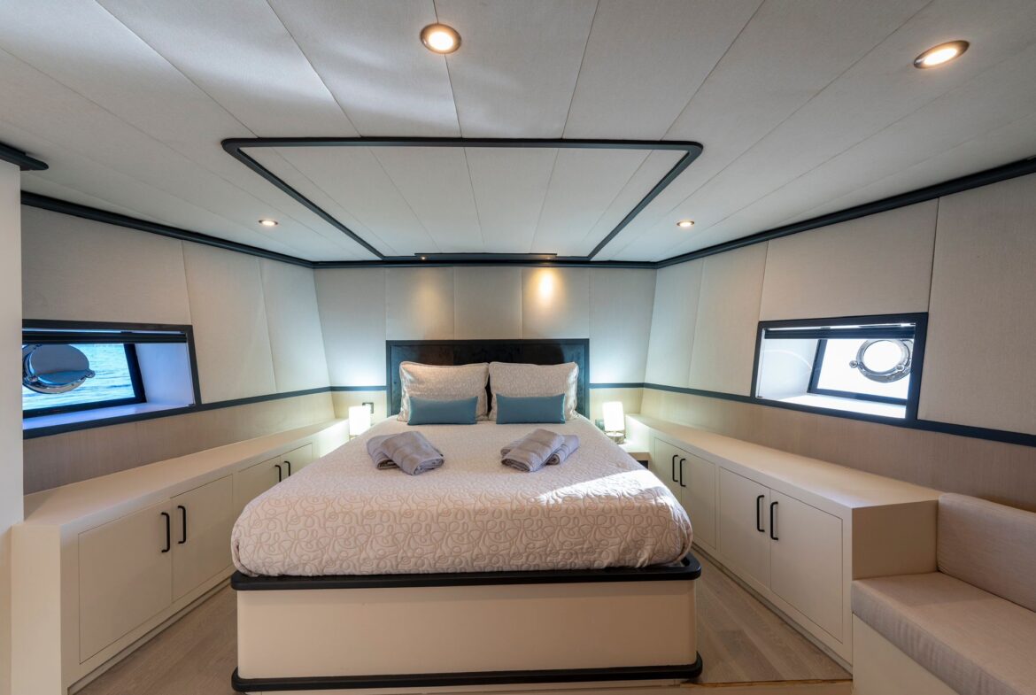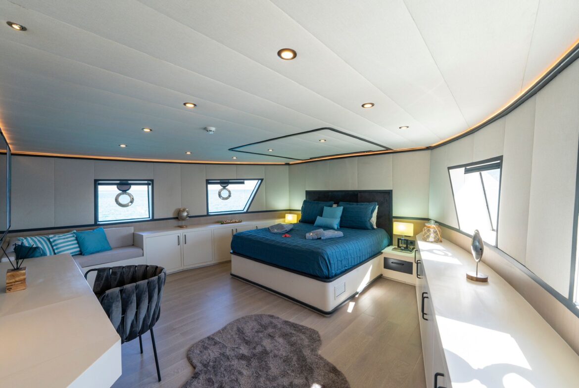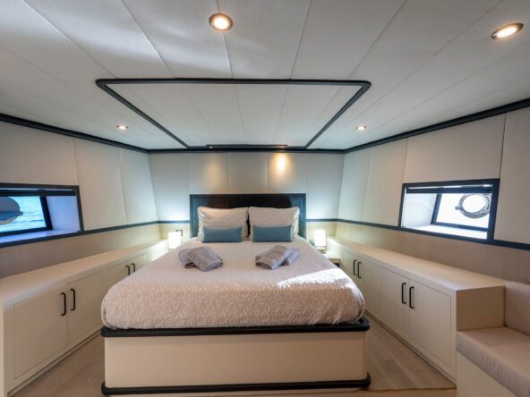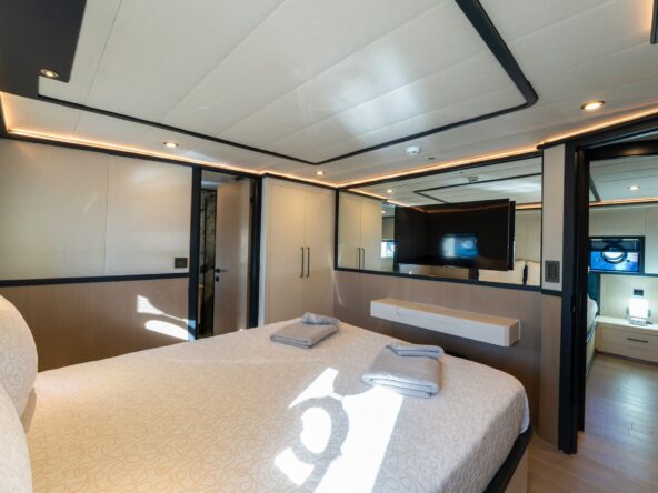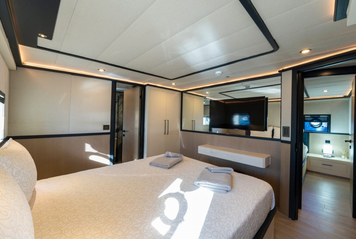 - 1 Master Kabin: Geniş ve ferah yapısıyla ön plana çıkar. Lüks mobilyalar, yüksek kaliteli yatak, geniş gardırop alanları, özel duşakabinli banyo, klima ve TV bulunur. Doğal ışık alan pencereleriyle rahat bir yaşam alanı sunar.