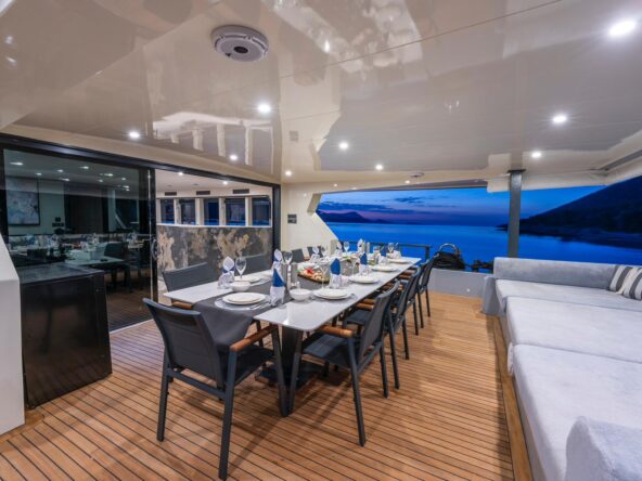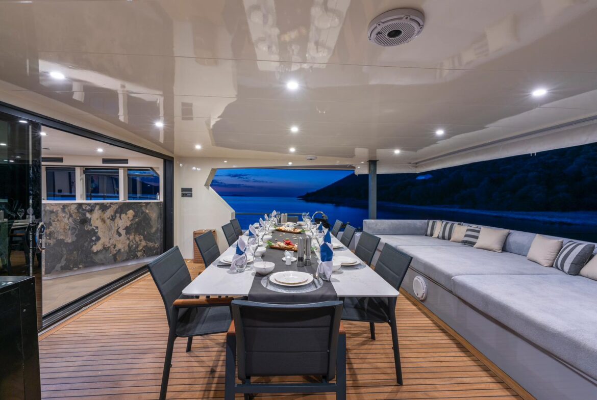 - Arka güvertede geniş oturma grubu ve yemek masası, keyifli yemek ve sohbet ortamı sağlar.