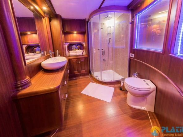2 Master Kabin: Her biri 2 yetişkin için geniş tasarlanmış olan master kabinler, yatın en lüks ve konforlu alanlarıdır. King-size yataklar, yüksek kaliteli nevresim ve yastık takımları ile donatılmıştır. Kabinlerde özel duşakabinli banyo, elektrikli tuvalet ve 24 saat klima bulunmaktadır. LCD TV, uydu bağlantısı ve internet erişimi ile modern yaşamın tüm olanakları sağlanmıştır. Her master kabinde geniş dolap alanı ve kişisel kasa mevcuttur. Panoramik pencereler, deniz manzarası eşliğinde doğal ışık sağlar.