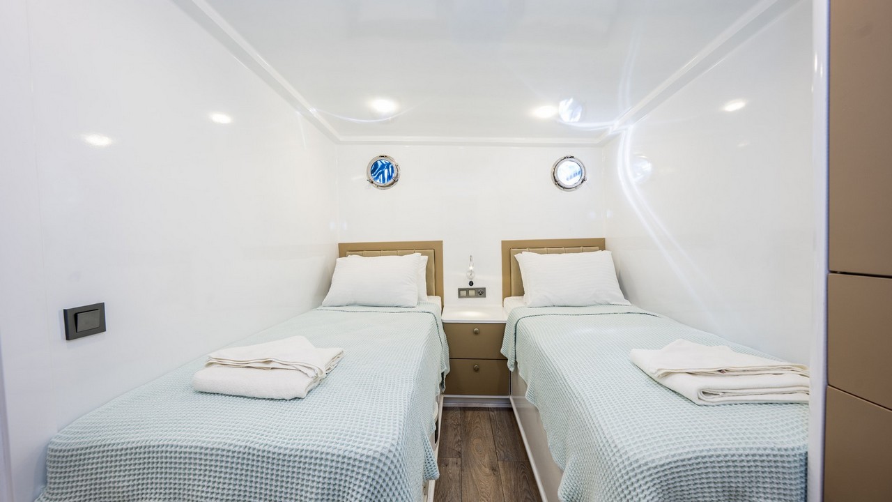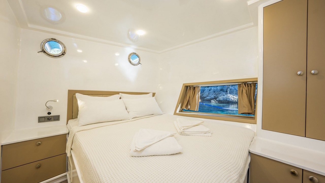 Gulette 8 çift kişilik kabin ve 2 ikiz (twin) kabin bulunmaktadır. Bu düzen, aileler, çiftler ve arkadaş grupları için idealdir. Her kabin, doğal hava akışını ve güneş ışığını en iyi şekilde alacak şekilde konumlandırılmıştır.