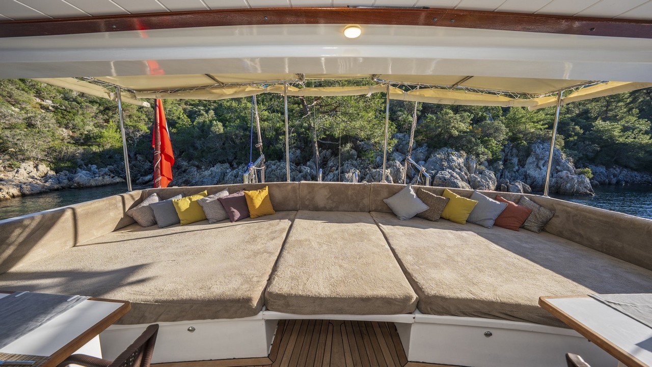 Holiday 5’in geniş güverte alanları, mavi yolculuğun açık havada yaşanmasını ön plana çıkarır. Ön ve arka güvertede yer alan minderli güneşlenme alanları, denizin ve güneşin tadını çıkarmak isteyen misafirler için idealdir. Gölgelikli oturma alanları ise sabah kahvesi, öğleden sonra dinlenme molaları veya gün batımı eşliğinde içecek keyfi için huzurlu bir ortam sunar. Açık hava yemek alanı sayesinde her öğün deniz manzarasıyla bütünleşir.