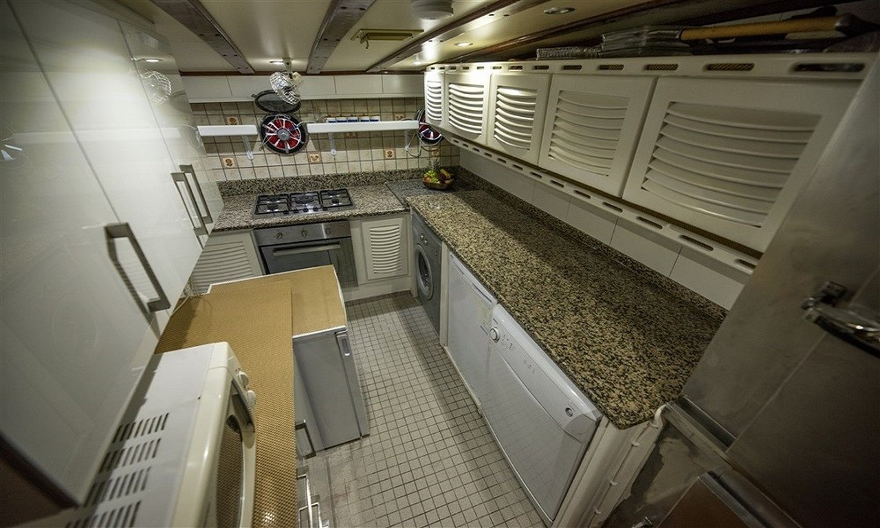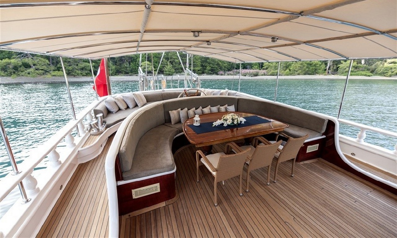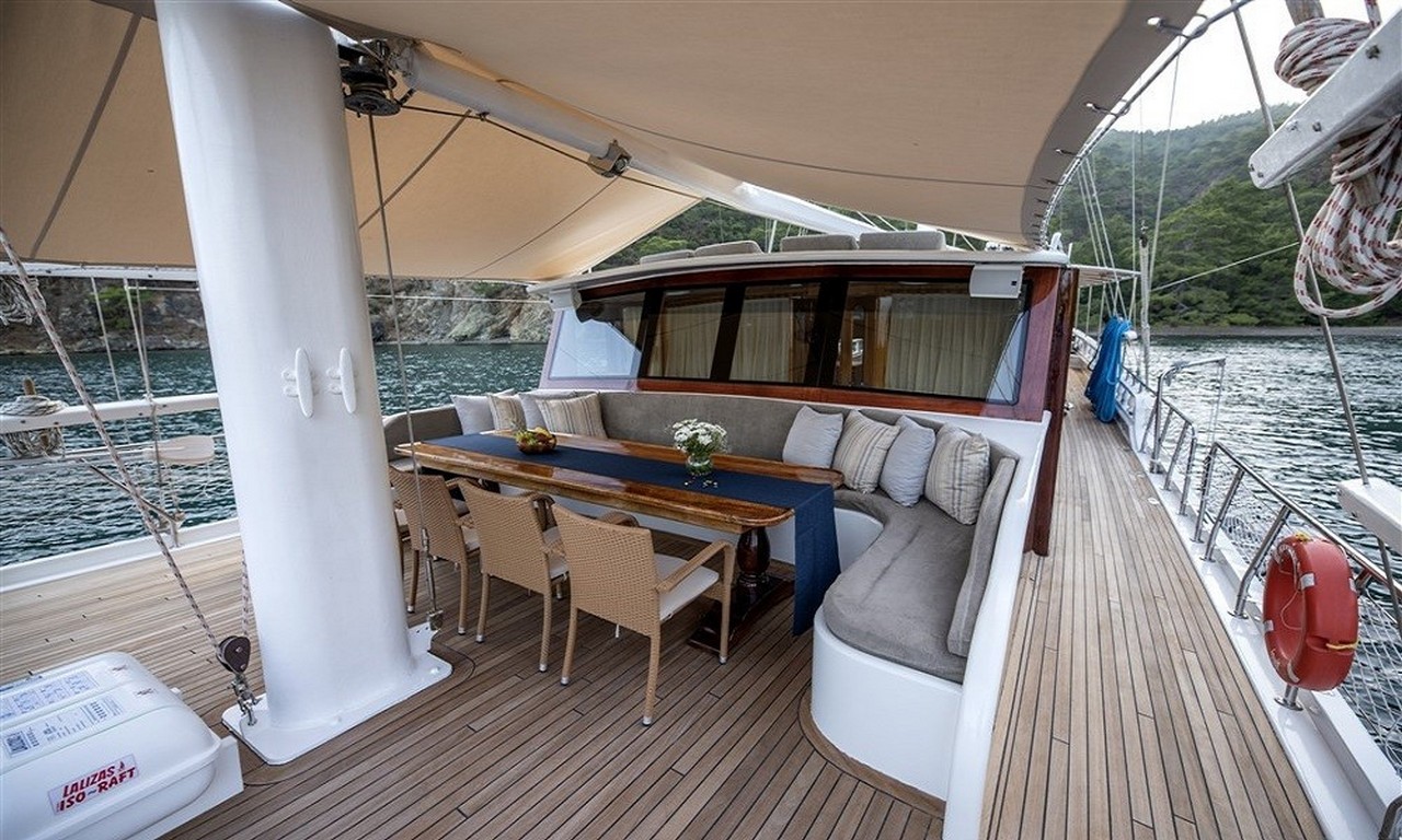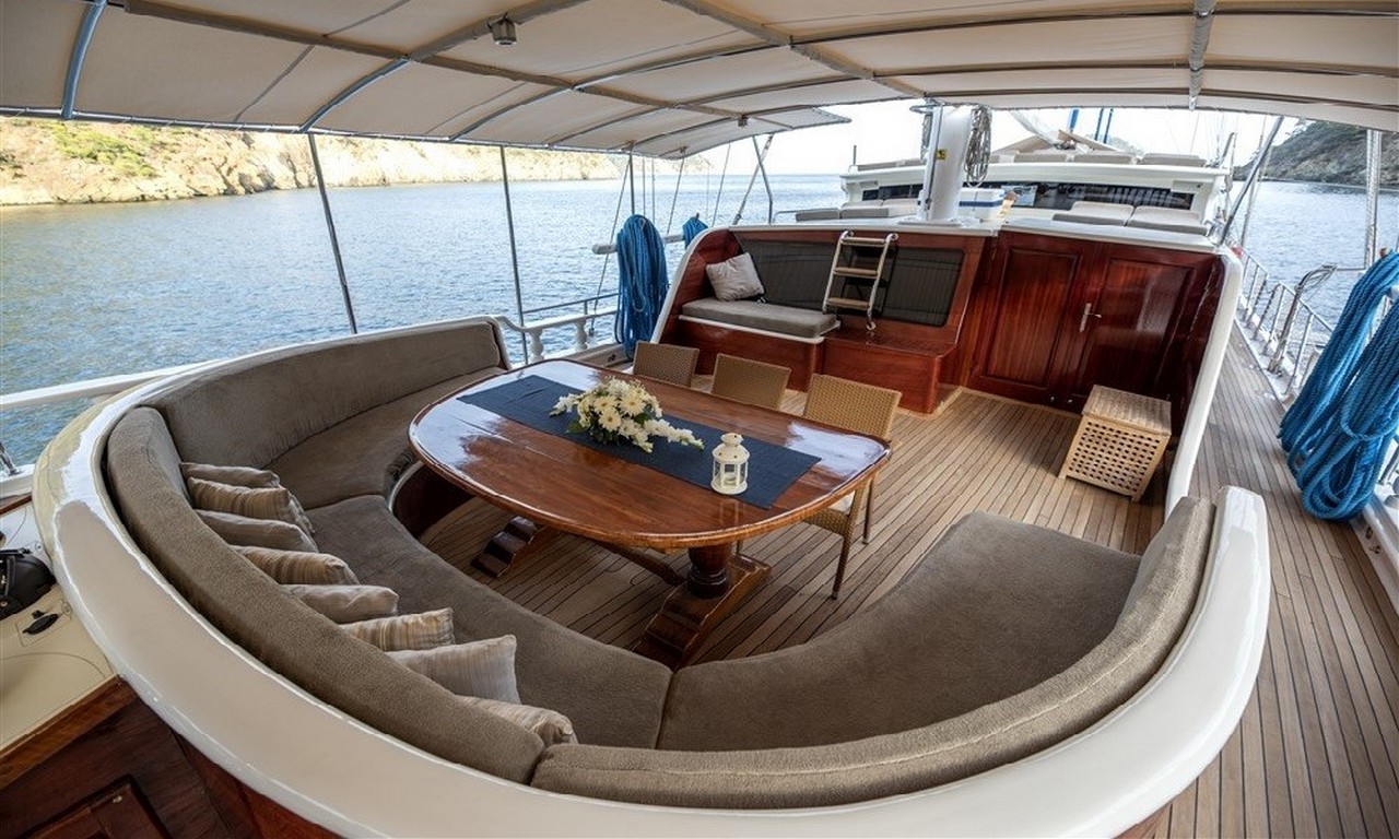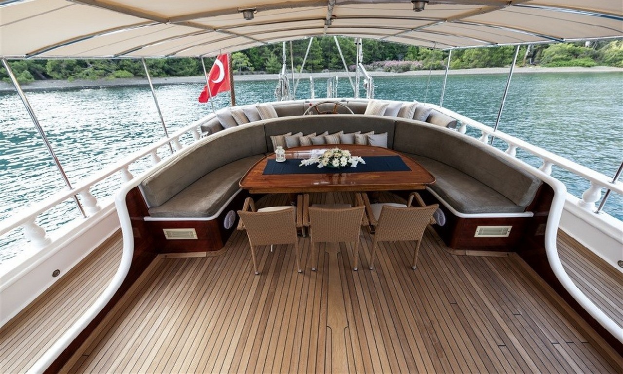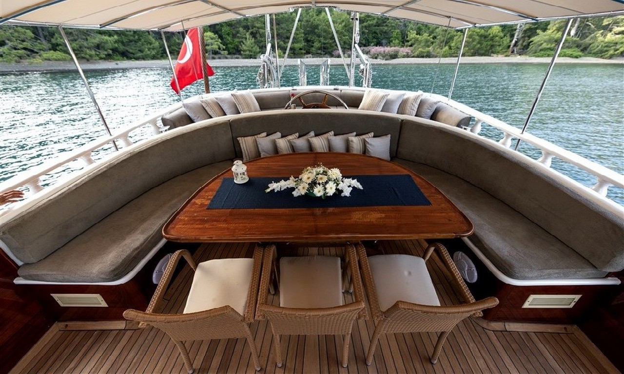 Arka güvertede geniş bir yemek masası ve oturma alanı yer almaktadır. Gün batımı sırasında servis edilen akşam yemekleri bu bölümde oldukça keyifli bir atmosferde sunulmaktadır. Profesyonel aşçı tarafından hazırlanan Akdeniz mutfağı ve Türk mutfağına ait lezzetler mavi yolculuk deneyimini daha da özel hale getirir.