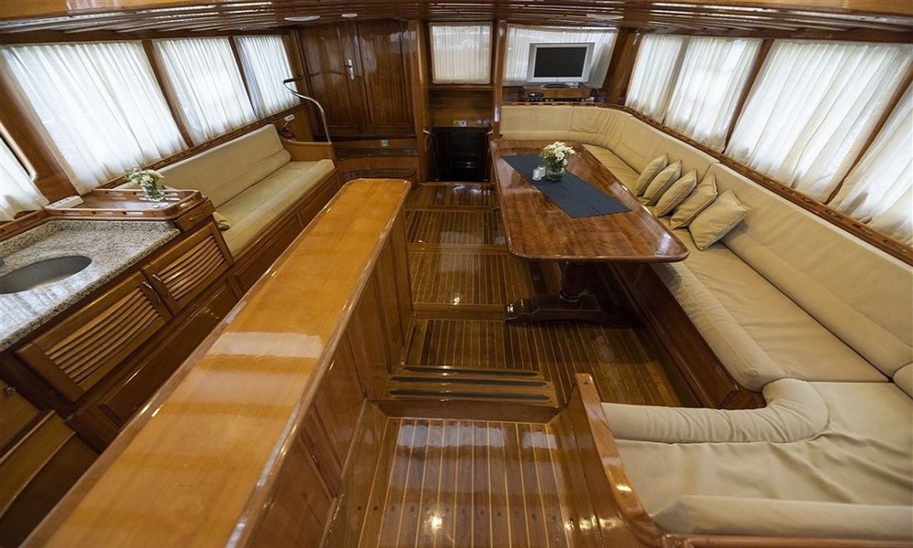 Teknenin salon bölümü konforlu oturma grupları, yemek masası ve eğlence sistemi ile donatılmıştır. Bu alan özellikle günün sıcak saatlerinde serin ve rahat bir dinlenme alanı sunmaktadır.