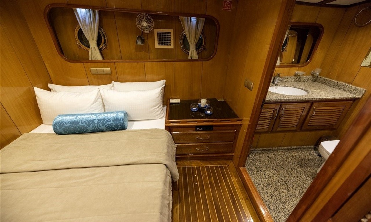 Her kabinde özel duş kabini ve WC bulunmaktadır. Kabinler ayrıca klima sistemi ile donatılmıştır ve sıcak yaz günlerinde serin bir ortam sunar. Kabinlerde geniş dolap alanları, aynalar ve depolama alanları yer almaktadır. Doğal ahşap dekorasyon sayesinde kabinlerde sıcak ve huzurlu bir atmosfer oluşur.