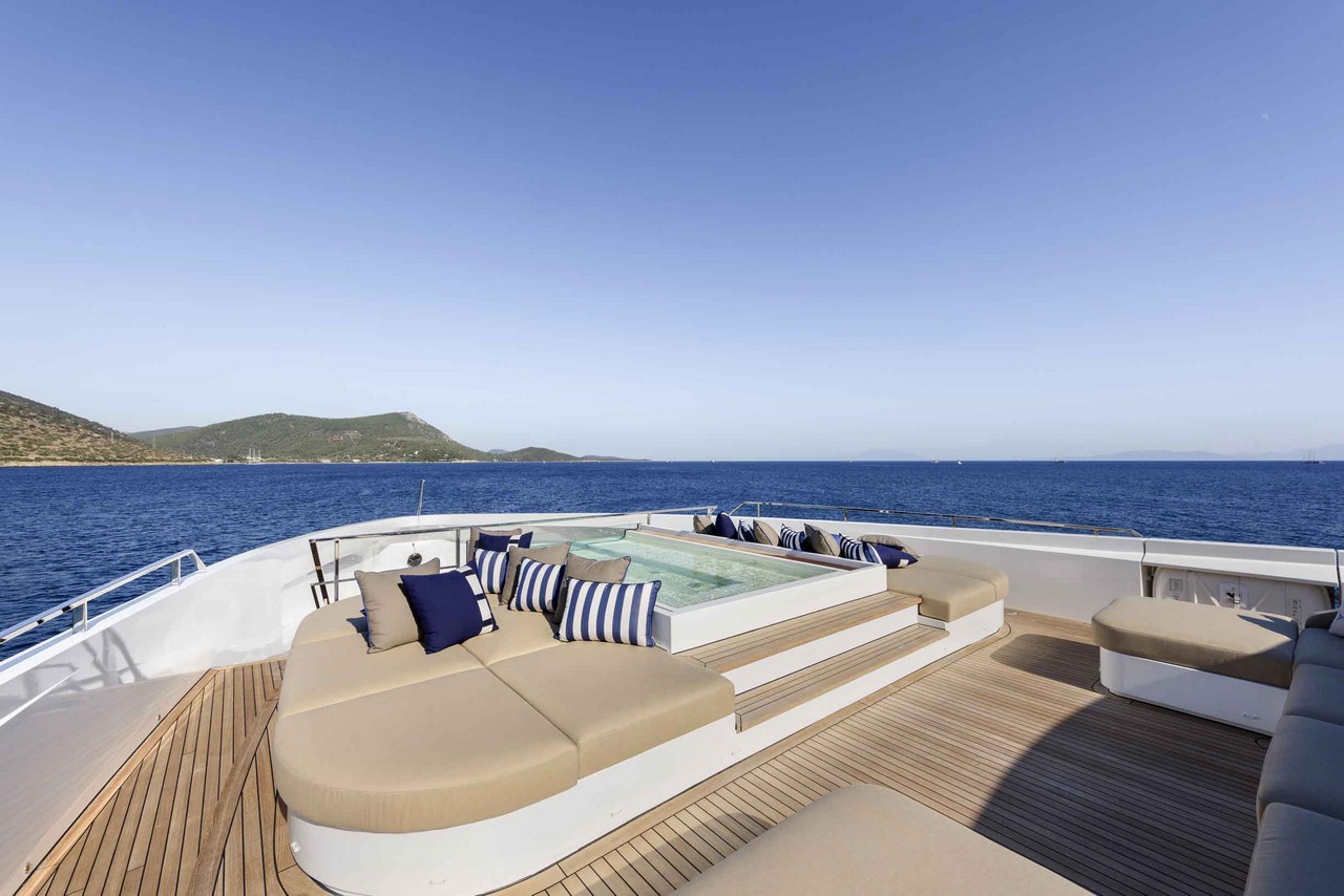 • Güneşlenme Alanı: Yan ve arka bölümde geniş minderlerle kaplı güneşlenme bölümleri, gün boyu rahatlamayı ön planda tutar.