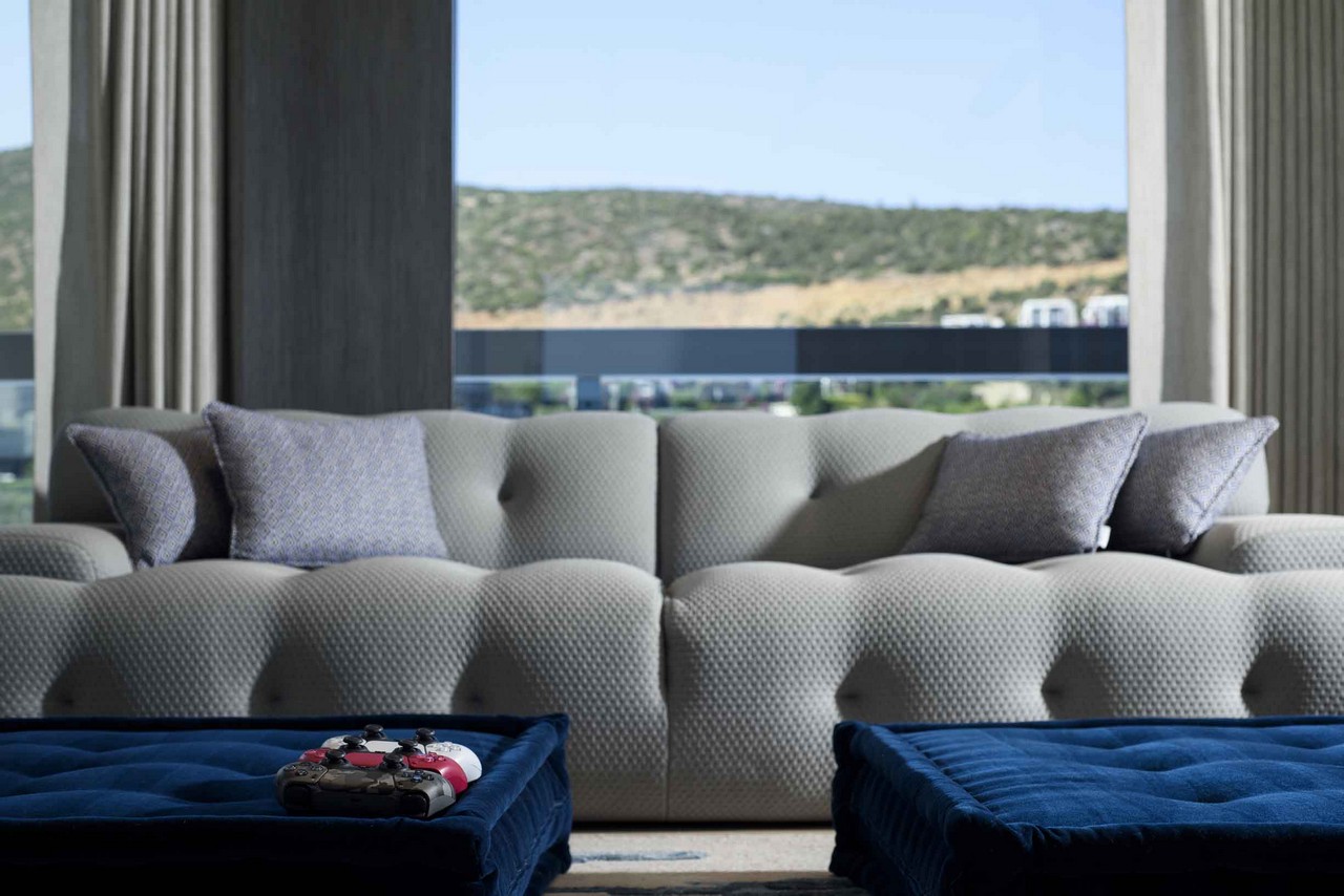 • Panoramik Camlar: Yerden tavana uzanan geniş cam yüzeyler, denizin ve çevredeki koyların manzarasını iç mekâna taşıyarak her anı bir tablo gibi yaşatır.