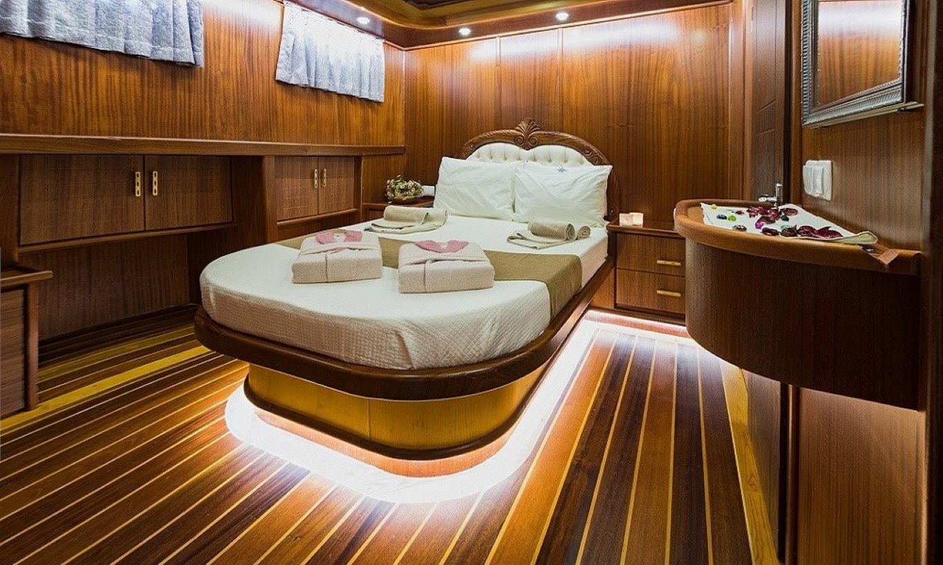 Gulet Kiralama S Nur Taylan, her biri özenle tasarlanmış ve konforlu olan 8 kabinde konaklama imkanı sunar. Misafirlerimize unutulmaz bir mavi yolculuk deneyimi yaşatmak için her ayrıntı düşünülmüştür. Her kabinde özel banyo ve tuvalet bulunurken, konukların rahatını ve gizliliğini sağlamak amacıyla dizayn edilmiştir.